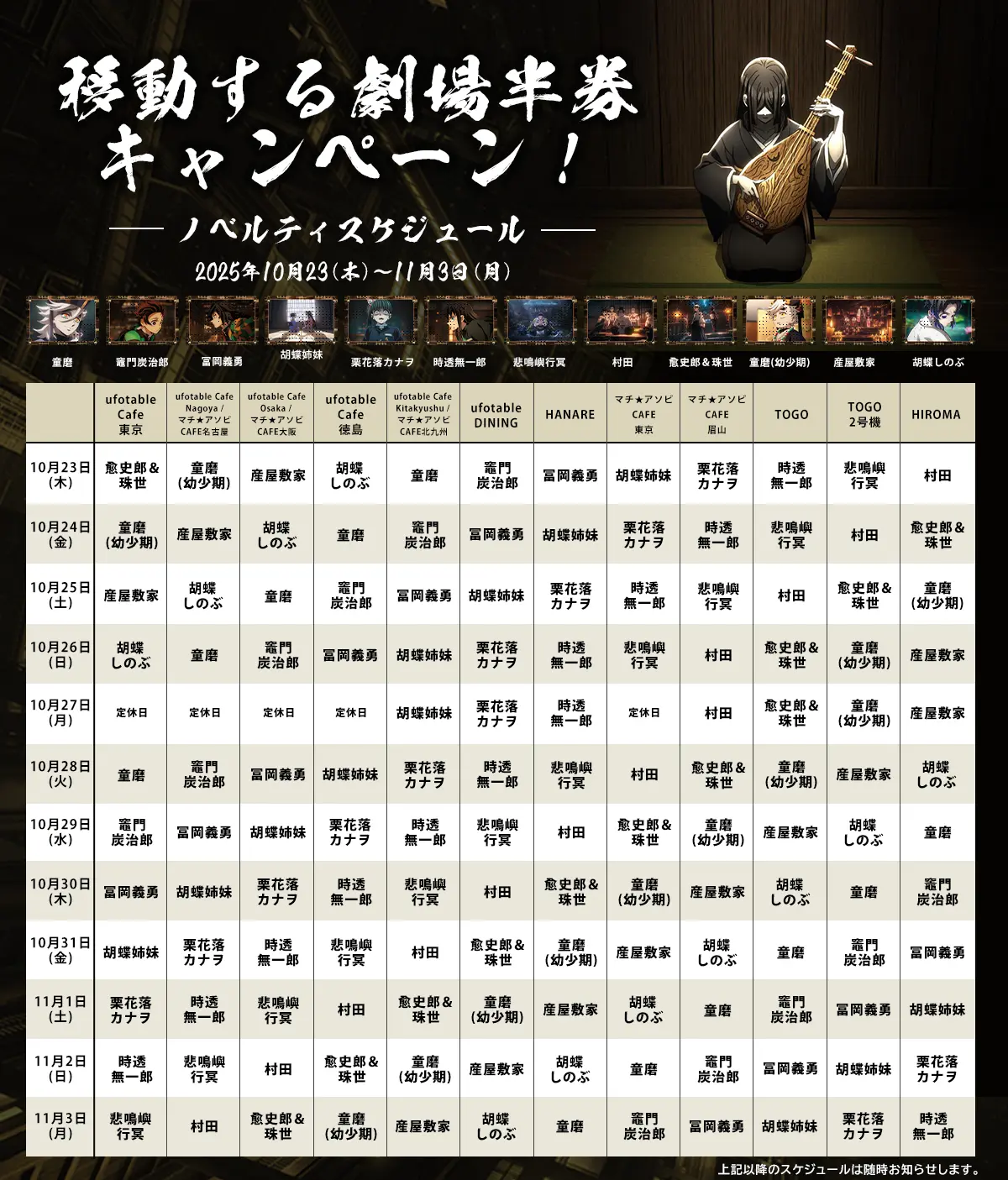 「劇場版『鬼滅の刃』無限城編 第一章 猗窩座再来」の劇場半券をカフェにお持ちいただいた方のみご注文いただけるドリンクの提供が決定!ノベルティのポストカードは当カフェの会期毎に絵柄が変わっていきます! 本作をご覧になった後は是非カフェにお越しください! ~「移動する」劇場半券キャンペーンとは~ 劇場半券キャンペーンドリンクのノベルティポストカードは店舗毎に違う絵柄になります。そしてそれらのノベルティポストカードは鳴女が琵琶を弾くと無限城が移動するように、毎日店舗間で移動していきます。ご来店されるお店の、ご来店予定の日のノベルティポストカードは何かご注目ください!