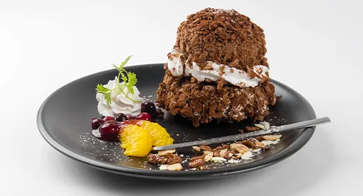 チョコムースとカスタードのケーキをチョコクランチでコーティング。