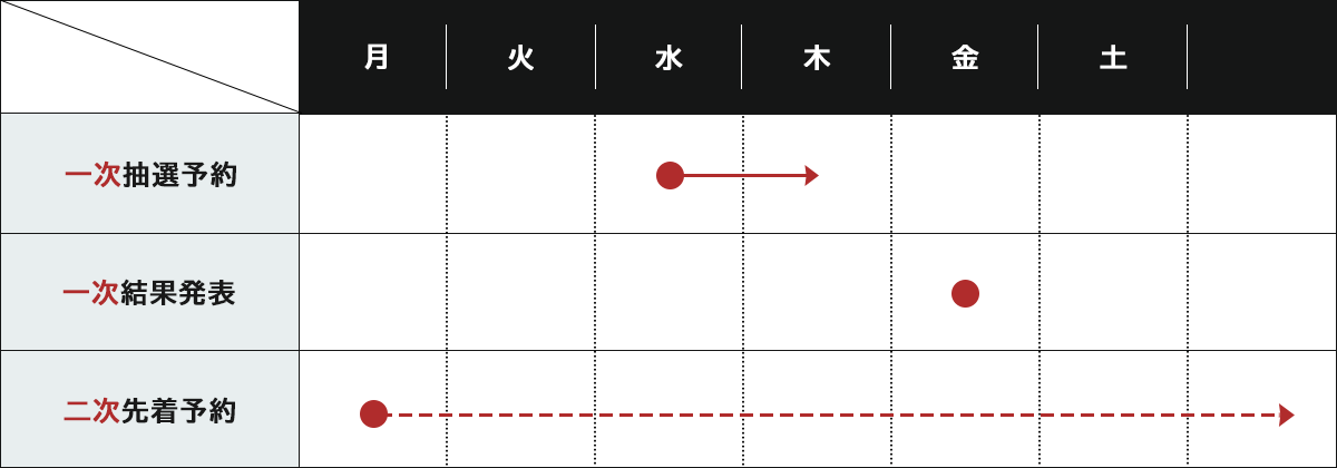 ※「一次抽選予約」にてキャンセルが発生した場合のみ「二次先着予約」が行われます。