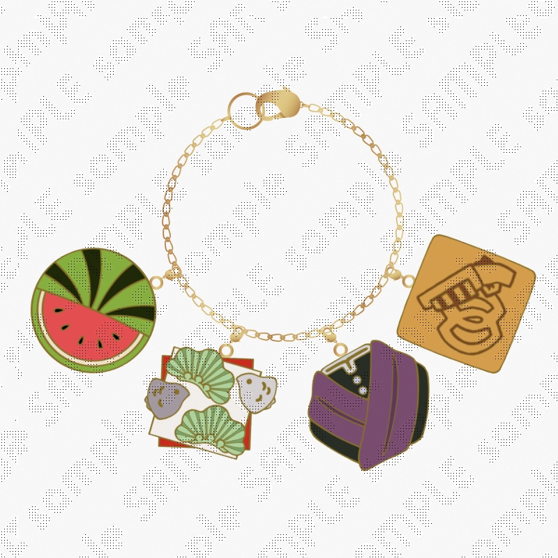 描き下ろしイラストに描かれた和菓子が、一つ一つチャームになっています。